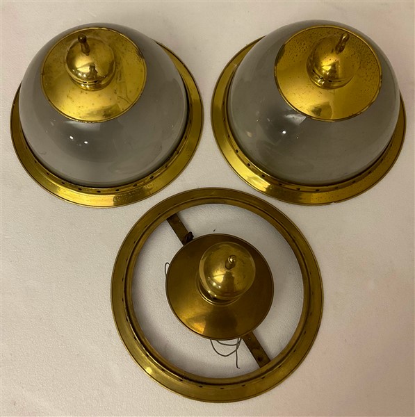 Gruppo di tre plafoniere modello "Mezzo Lampione". Produzione Azucena, Milano, anni '50. Struttura in ottone e calotta in vetro acidato sulla superficie interna. (h cm 27; d cm 36) (difetti e mancanze)