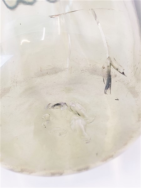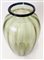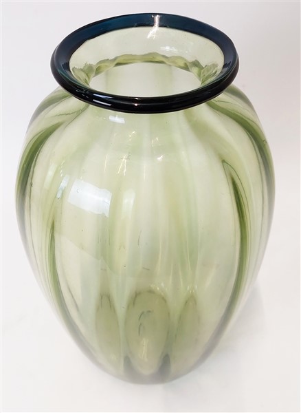 Vaso in vetro soffiato trasparente verdino e costolato, rifinito sullorlo in vetro blu. Murano, anni '20. (difetti)
