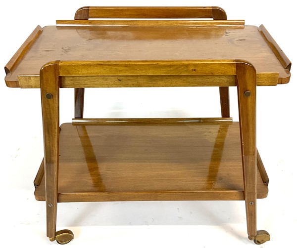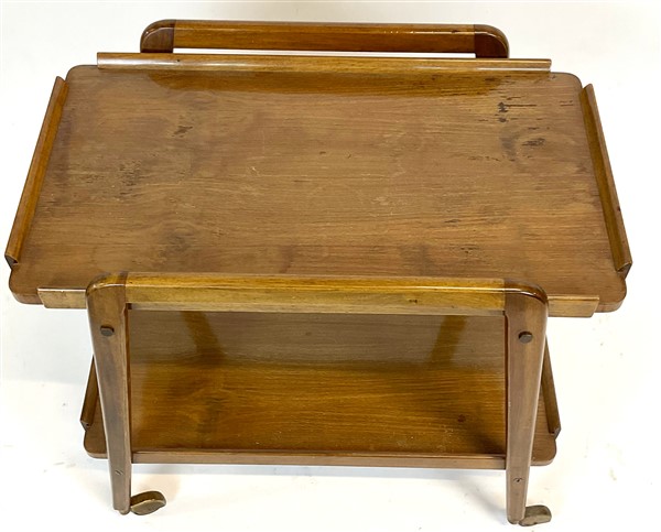 Carrellino a due ripiani in legno con ripiani a vassoio di cui quello superiore asportabile. Produzione Fact, Italia, anni '50. (difetti)