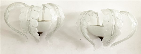 Coppia di applique in vetro pulegoso lattimo e incolore, composte da una coppa semicilindrica e da tre foglie di acanto. Anni '30/'40. (difetti)