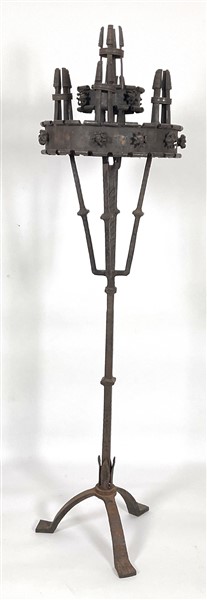 Portaceri in ferro battuto a cinque fiamme su corona circolare decorata con fiori, base tripode. Italia, 1900ca.