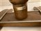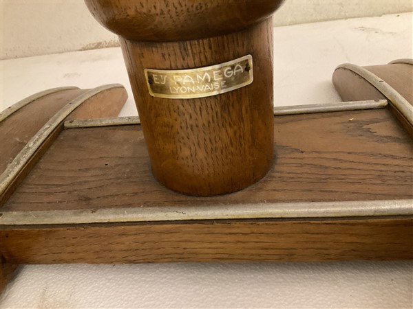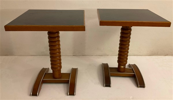 Coppia di tavolini in legno con fusto tornito, base sagomata con profili in metallo, piano quadrato con inserto in laminato nero. Lione, metà secolo XX. Etichetta metallica. (cm 60x73x60) (difetti)