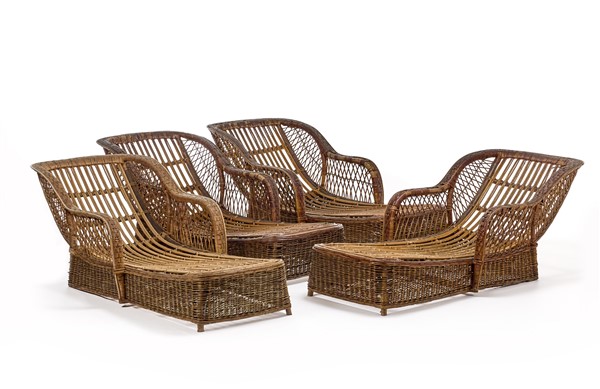 Gruppo di quattro sdraio da giardino in manao scortecciato e malacca. Italia, anni '60. (cm 79x67x175) (difetti e mancanze)