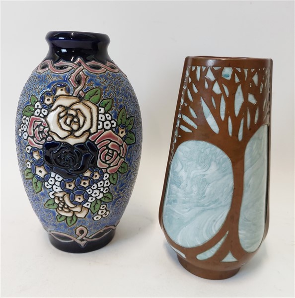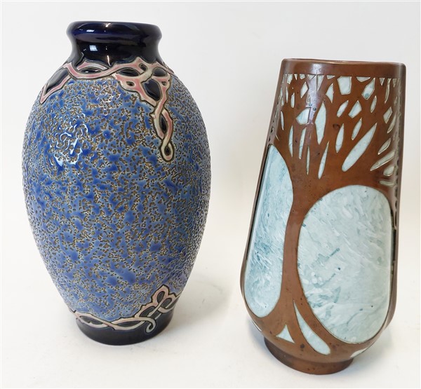 Lotto composto da due vasi Art Déco rispettivamente uno a decori floreali su fondo blu cobalto e uno in ceramica marmorizzata con ghiera in rame. 1925ca. (h max cm 27) (lievi difetti)