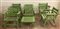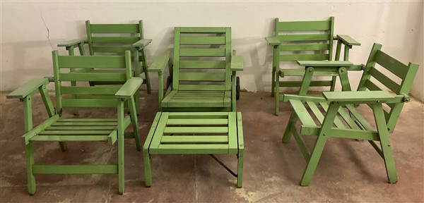 Fornitura da giardino composta da quattro poltroncine, un tavolino ed una sdraio munita di rotelle pieghevoli, legno smaltato verde. Italia, anni '60. Recanti marchio del produttore. (difetti)