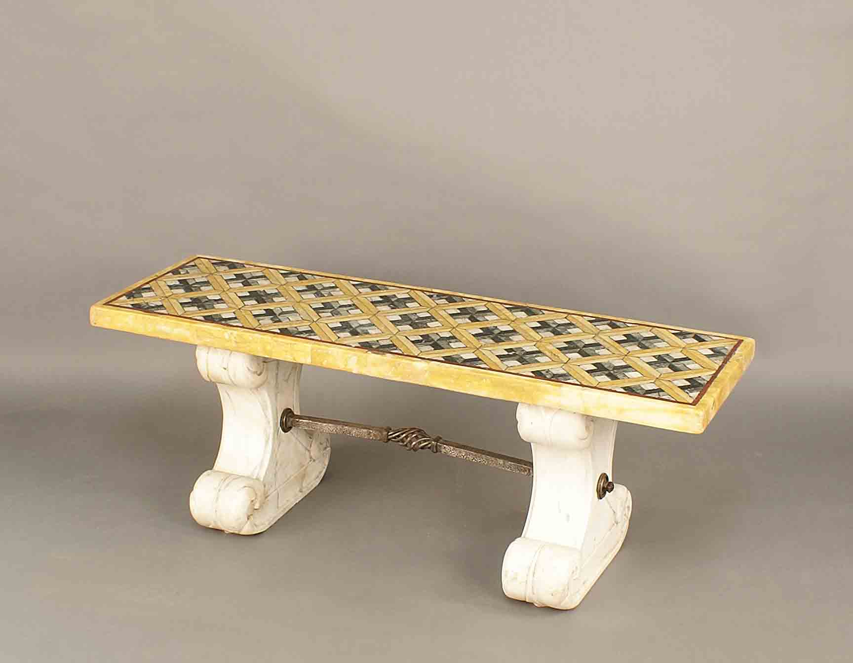 Panchina con piano rettangolare intarsiato in marmi vari a motivo geometrico...