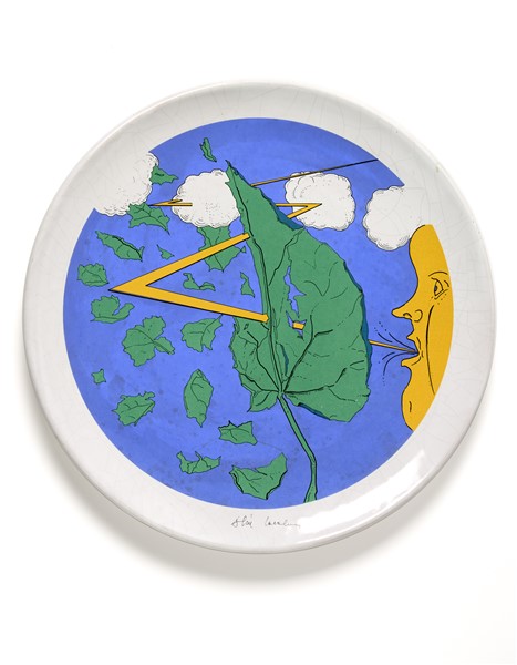 Piatto della serie "Le stagioni". Esecuzione Studio Ernan, Albisola, fine anni '70. Ceramica dipinta in blu, verde e giallo su fondo bianco. Firmato e numerato 58/120 al verso. (d cm 36)