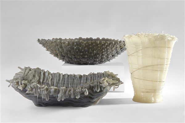 Lotto composto da un vaso e due centrotavola. Italia, anni 2000. Silicone bianco e grigio. (vaso: h cm 27; centrotavola: cm 44x46, centrotavola: d cm 46)
