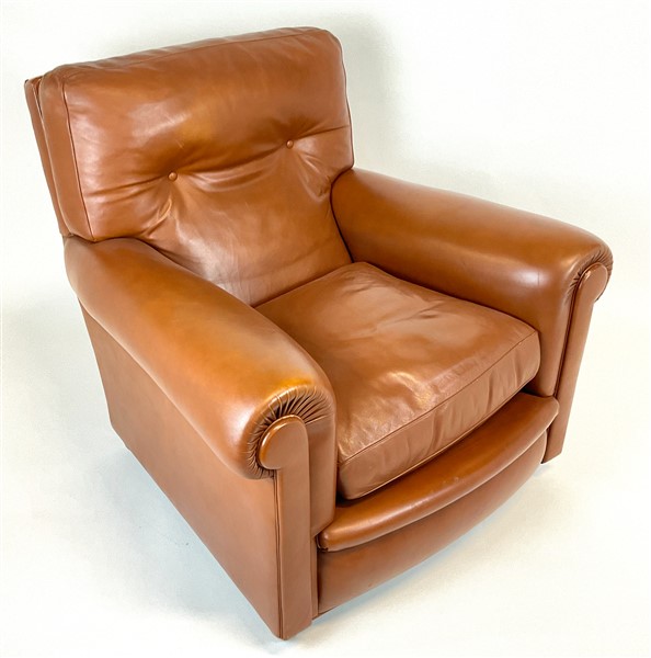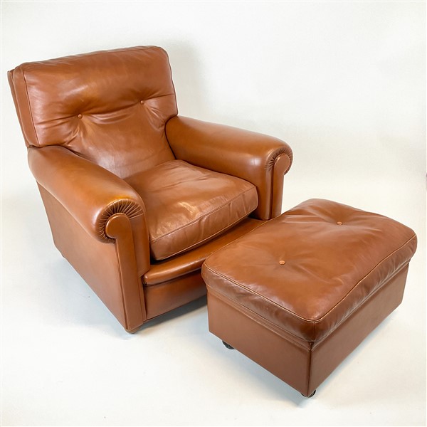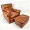 Poltrona in pelle marrone con poggiapiedi analogo munito di rotelle. Italia, anni '80/'90. Marcata e recante etichetta metallica. (poltrona cm 95x89x48, poggiapiedi cm 70x40x48) (lievi difetti)