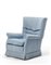 Poltrona con piedini posteriori arcuati e rastremati verso l'esterno e piedini anteriori a sezione quadrata e scanalati su due lati. Probabile eseuzione Fratelli Lietti fu Paolo, Cantù, 1955/1956. Legno massello, tessuto azzurro. (cm 79x94x87) (lievi difetti e restauri)