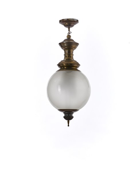 Lampada a sospensione modello "LS1GC". Produzione Azucena, Milano, 1954. Ottone e vetro soffiato satinato sulla superficie interna. (d cm 32) (lievi difetti)