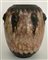 Vaso in ceramica smaltato nei toni del bruno decorato con motivo simbolista di teste a rilievo. Inizio secolo XX. Marcato e numerato sotto la base.