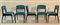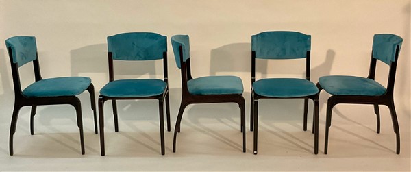 Cinque sedie. Produzione Cantieri Carugati, Italia, anni '60. Sedute e schienali rivestiti in tessuto azzurro. (lievi difetti)
