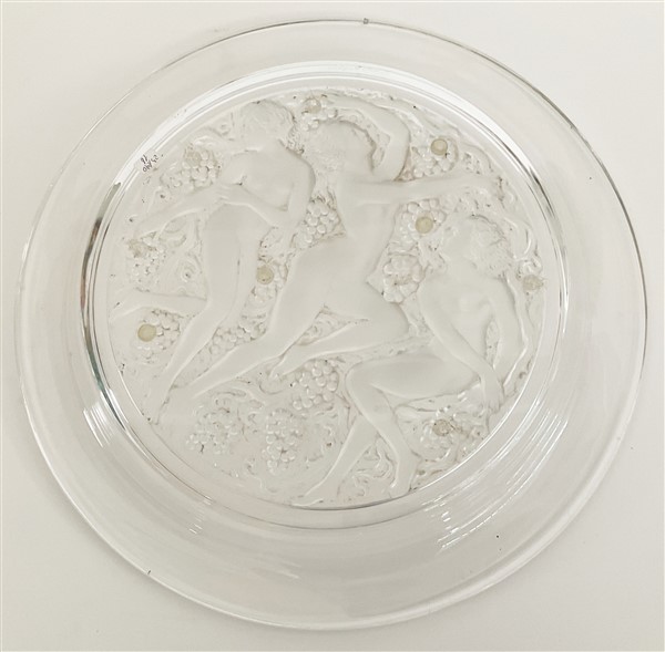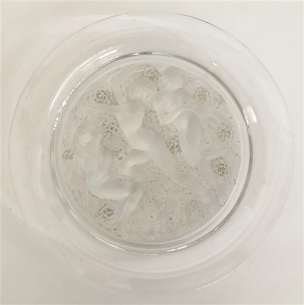 Centrotavola decorato da baccanti fra pampini e grappoli d'uva in vetro parzialmente acidato. Francia, secolo XX. Firmato a punta "Lalique France". (d cm 40) (difetti)