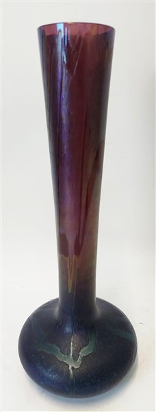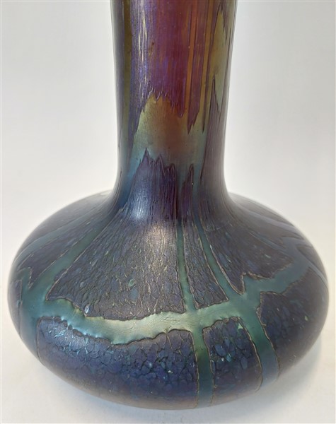 Vaso in vetro soffiato trasparente ametista con macchie e striature iridate a leggero rilievo. Austria, prima metà secolo XX. (h cm 46) (lievi difetti)