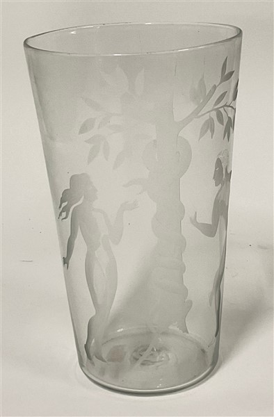 Vaso in vetro trasparente incolore decorato alla mola con scena abbozzata raffigurante il peccato originale. Anni '20. (h cm 29)