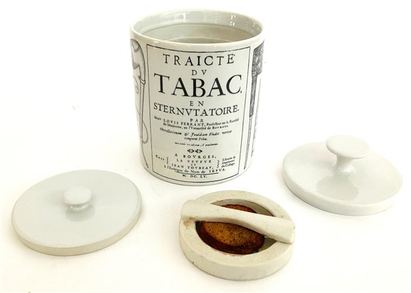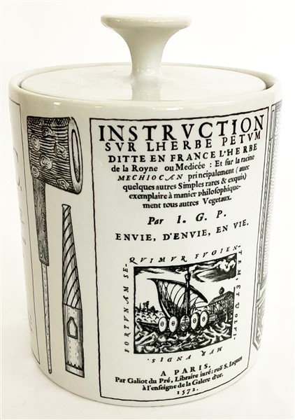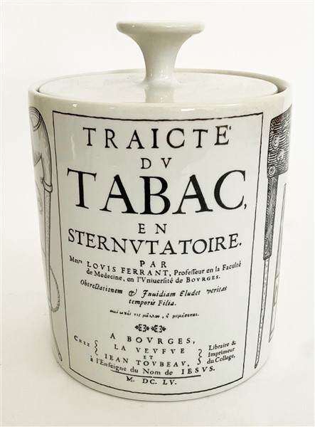 Humidor. Milano, anni '60. Porcellana serigrafata in nero con decoro “Le bon usage”. Marcata alla base. (h cm 23) (lievi difetti)