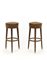 Coppia di sgabelli su disegno. Italia, 1959ca. Gambe troncoconiche in legno, raccordi in metallo, seduta in cuoio. (h cm 79; d cm 36) (difetti)