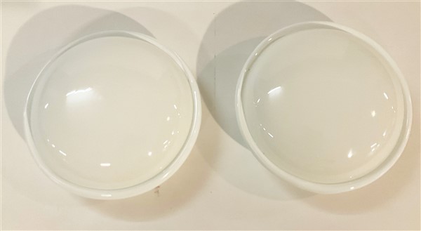Coppia di plafoniere. Murano, 1991. Vetro soffiato lattimo bordato bianco. Firmate a punta "venini '91". (d cm 30)