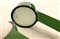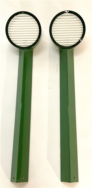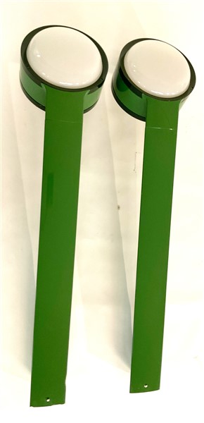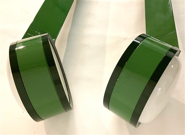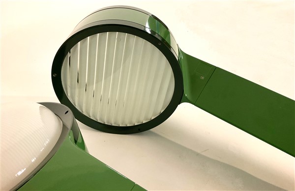 Coppia di lampade per esterni modello "Tamburo". Produzione Flos, Milano, anni '70. Metallo e alluminio pressofuso laccato verde, doppio paralume in vetro. Marcate. (cm 35x155) (lievi difetti)
