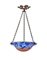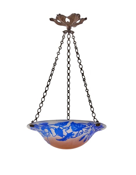 Lampada a cesendello. Nancy, inizio secolo XX. Vetro a cammeo inciso all'acido con decori floreali nei toni del blu, struttura in bronzo. Firmato a cammeo "Gallé". (d cm 39) (lievi difetti)