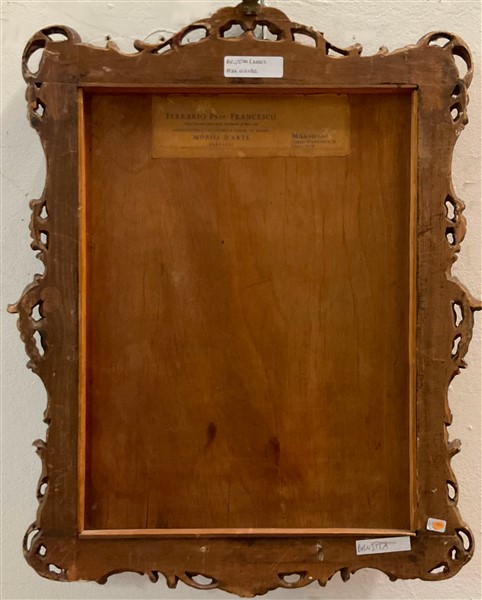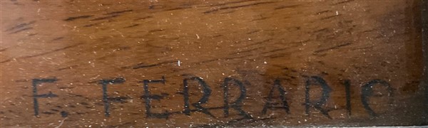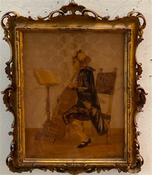 F. Ferrario, Suonatore di violoncello, tarsia in legni di varie essenze (cm 39x29) (difetti) Firmata in basso a destra, in cornice. Etichetta al retro