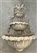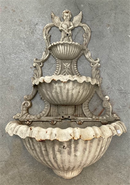 Fontana da parete in ghisa a tre vasche sormontata da putto alato e volute fogliate (h. cm 70) (difetti)