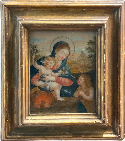 Anonimo del secolo XVIII, Madonna con Bambino e San Giovannino, olio su vetro (cm 21x17,5) (gravi rotture) In cornice