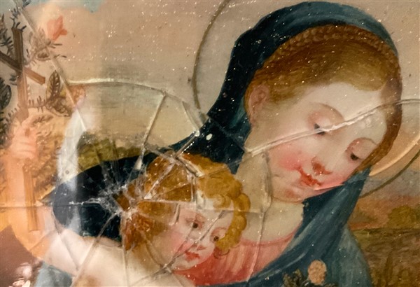 Anonimo del secolo XVIII, Madonna con Bambino e San Giovannino, olio su vetro (