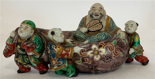 Gruppo scultoreo in porcellana policroma raffigurante saggio con bambini Giappo