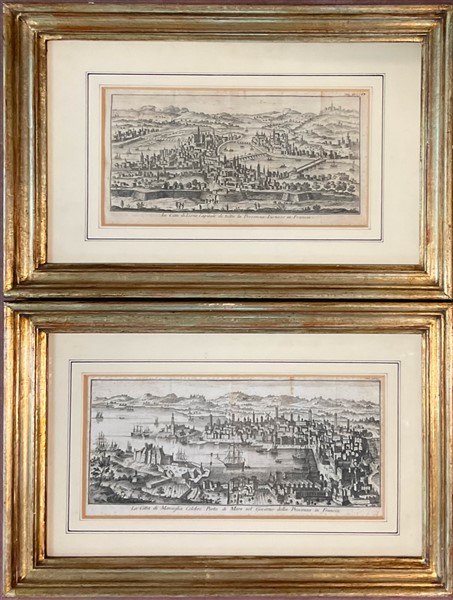 Due acqueforti raffiguranti la città di Lione e la città di Marsiglia