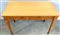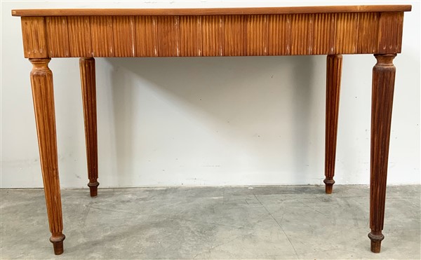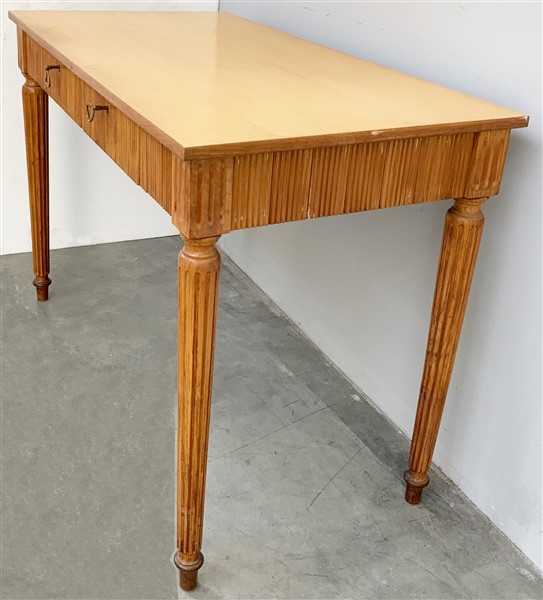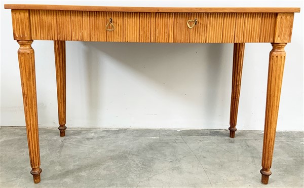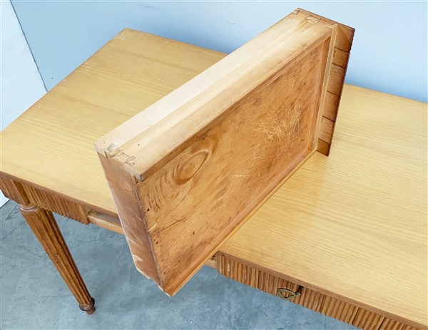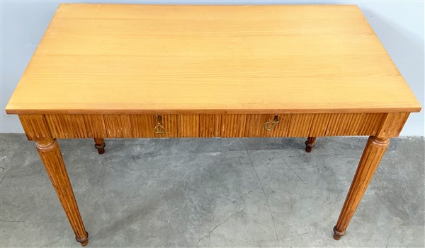 Tavolino in legno chiaro con gambe tornite e scanalate, fascia grissinata con due cassetti. Secolo XX (cm 108,5x76x57) (difetti)
