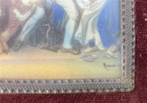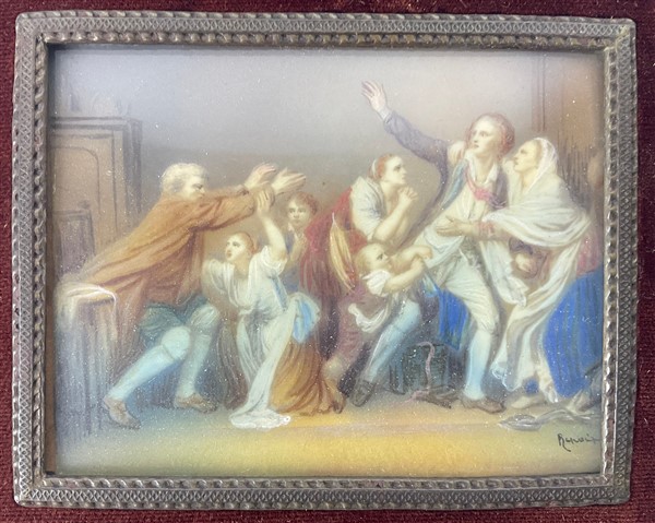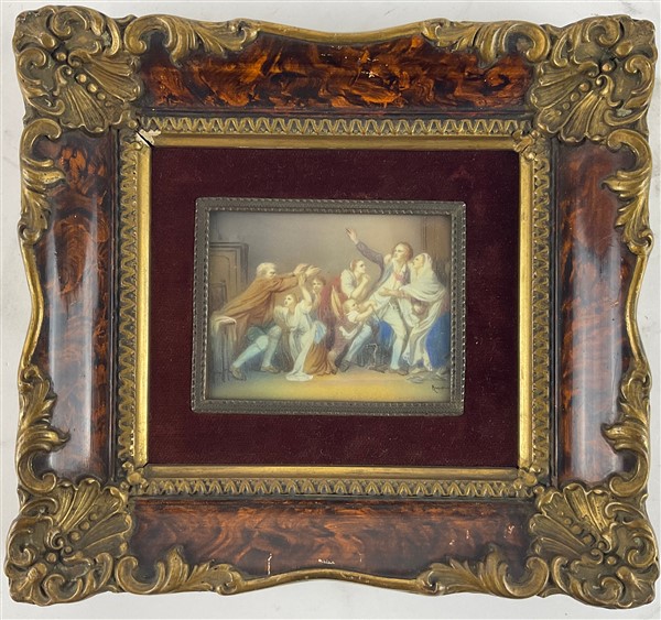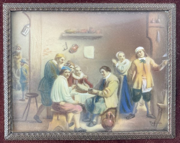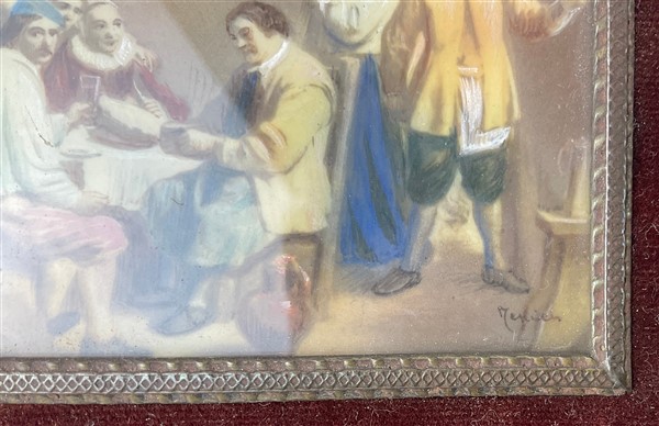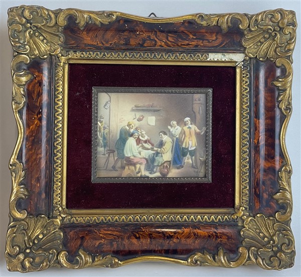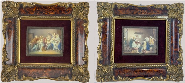 Anonimo del secolo XX. Scene di interno con figure, coppia di miniature su avoriolina (cm 6x8) (difetti) In cornice