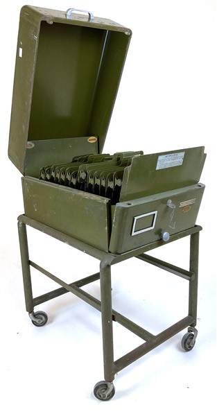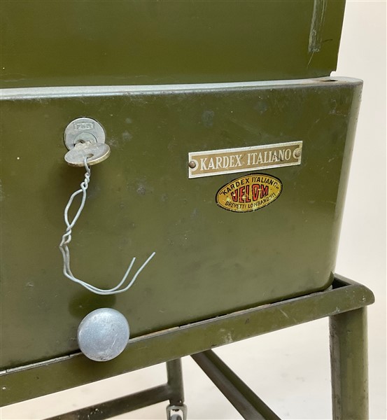 Classificatore in metallo verniciato verde, marcato Kardex. Italia, metà secolo XX. (difetti)
