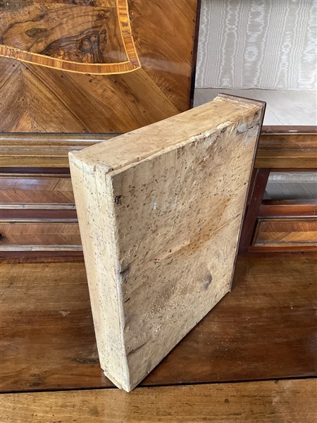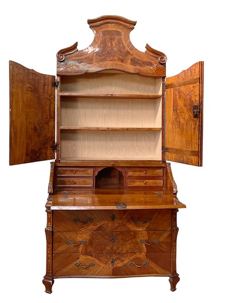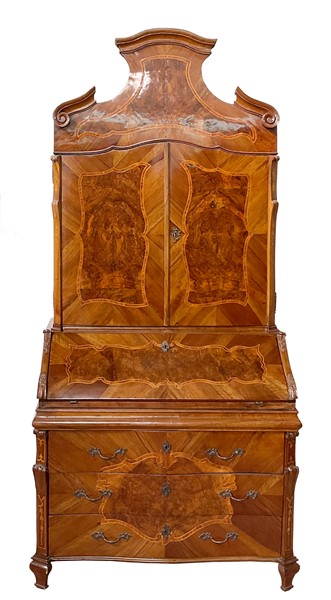 Trumeau lastronato, filettato e intarsiato in legni di varie essenze, con riserve in radica. Parte inferiore con fronte mosso a tre cassetti ed uno dissimulato sotto la ribalta, calatoia che rivela quattro tiretti e vano a giorno, montanti mossi e intagliati. Parte superiore a due ante e cimasa a timpano spezzato. Secolo XVIII (cm 126x262x61) (difetti e restauri)