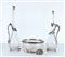 Lotto composto da due bottiglie in vetro con ghiere, tappi e prese in metallo argentato decorate a tralci di vite e uva (h. max cm 46), una fruttiera con bordo a motivi fioriti (h. cm 11,5; d. cm 23, 5 ca.) e una paletta traforata decorata a mascheroni a rilievo e incisi e motivi vegetali (difetti)