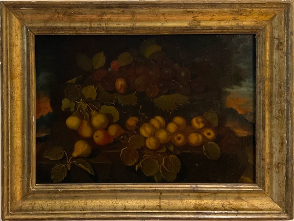 Scuola romana del secolo XVII "Composizione di frutta all'aperto" olio su tela,
