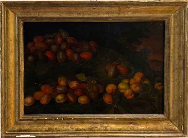 Scuola romana del secolo XVII "Composizione di frutta all'aperto" olio su tela,