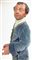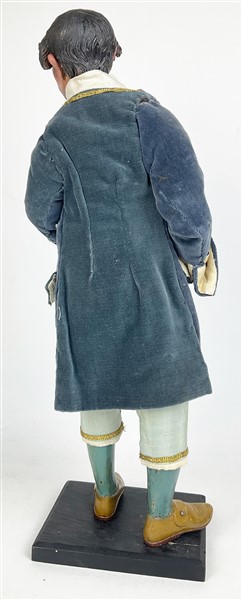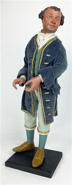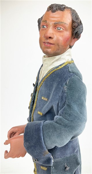 Arte dell'Italia meridionale, fine del secolo XIX. Scultura da presepe in legno intagliato raffigurante personaggio popolare con giacca blu, abiti in tessuto e seta con applicazioni in metallo dorato (h. cm 40) poggiante su base squadrata (lievi difetti)