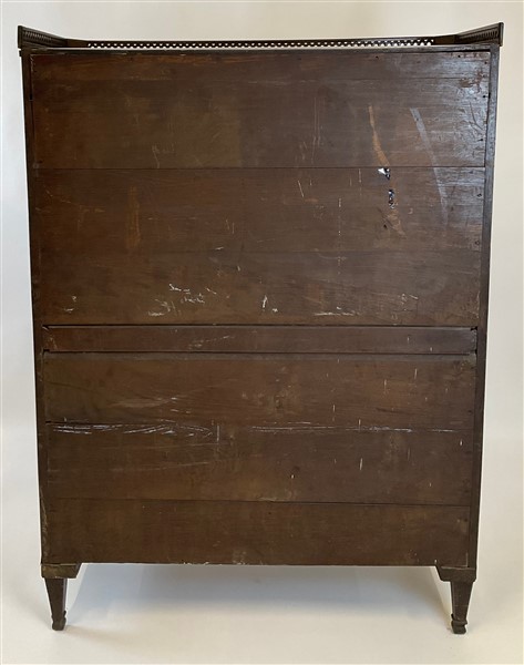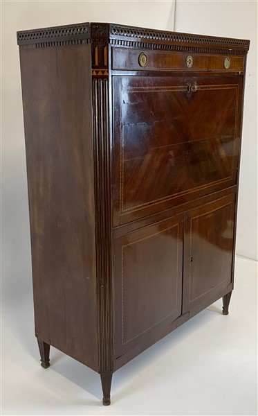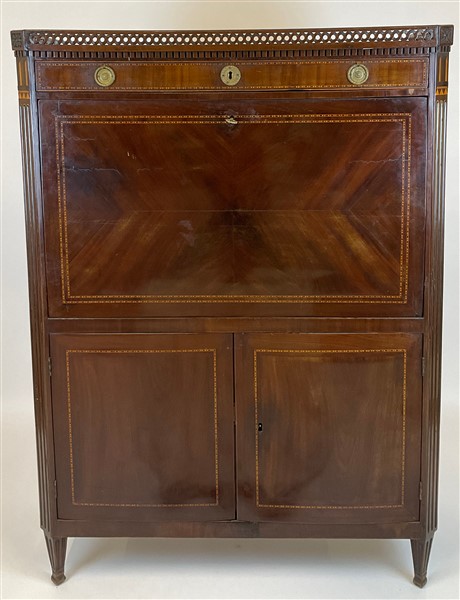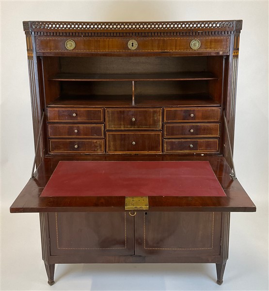 Secretaire lastronato e filettato in legni vari, fronte a due ante e un cassetto sottopiano, calatoia celante otto tiretti e vani a giorno, gambe e montanti scanalati, bordura superiore traforata. Francia, secolo XVIII (cm 108x147x47) (difetti e restauri)