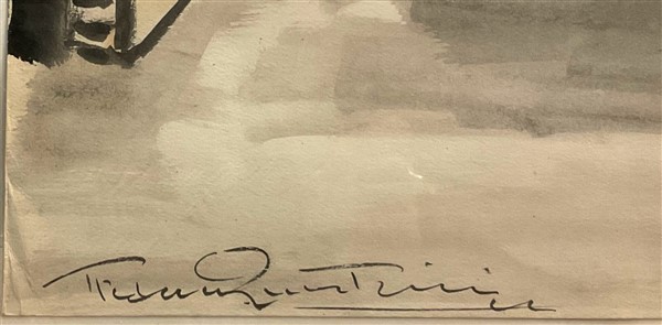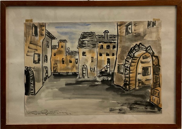 Lotto composto da una china acquerellata raffigurante Don Chisciotte e un acquerello raffigurante scorcio di paese, di autori e misure diverse (misura max cm 69x49) firmati, in cornici (difetti)