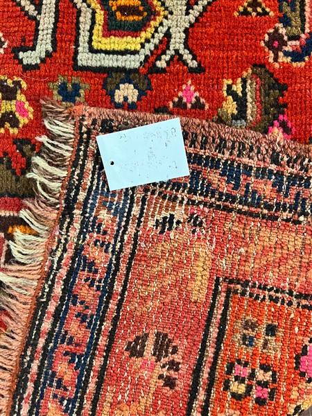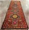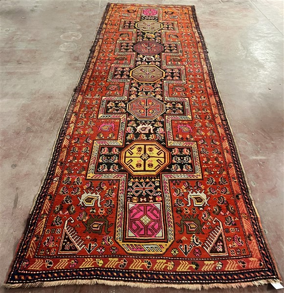 Tappeto galleria Karabagh, Caucaso, inizio secolo XX. Decoro con medaglioni ottagonali su campo blu notte, campo esterno a fondo rosso decorato con pavoni e simboli floreali stilizzati (cm 412x133) (difetti)