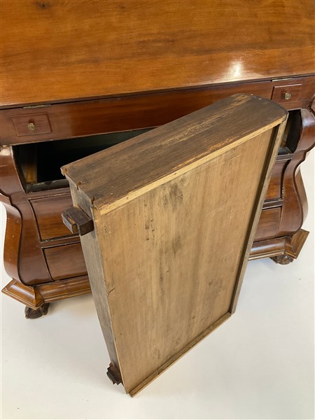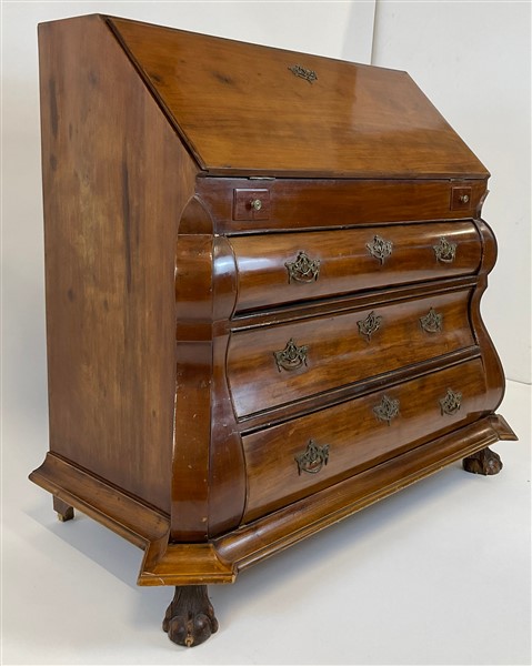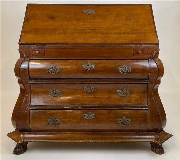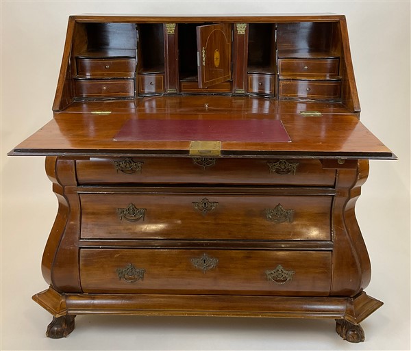 RIbalta in mogano con fronte mosso a tre cassetti e calatoia celante sette tiretti, anta e vano con piano scorrevole, piedi ad artiglio su sfera. Olanda, secolo XIX (cm 120x105x60) (difetti)