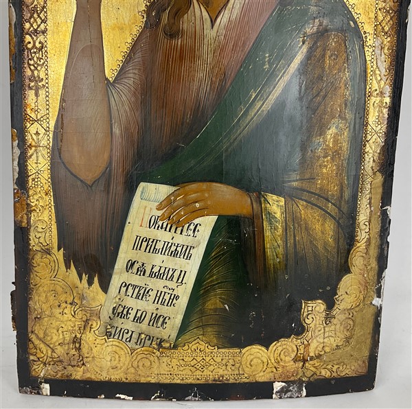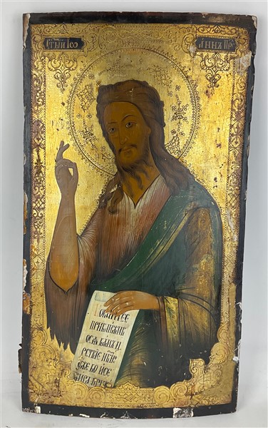 Icona russa del secolo XIX, San Giovanni Battista della Deesis, tempera su tavola a fondo oro (cm 64x36) (gravi difetti)