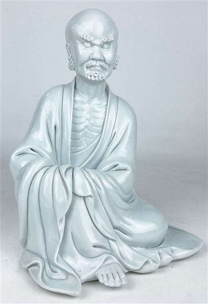 Statuetta in porcellana bianca Dehua raffigurante un Luohan recante etichetta C