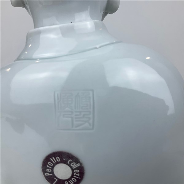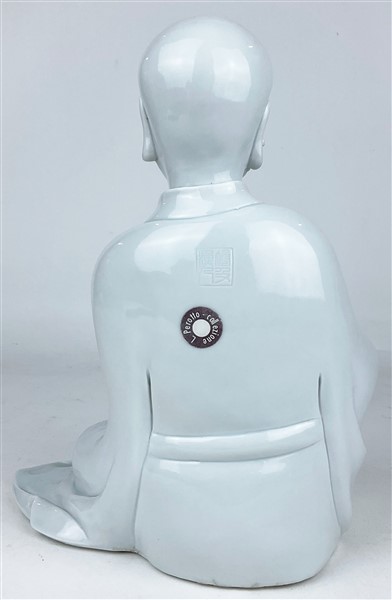 Statuetta in porcellana bianca Dehua raffigurante un Luohan recante etichetta Collezione Perotto