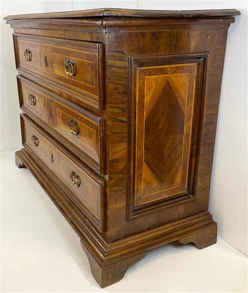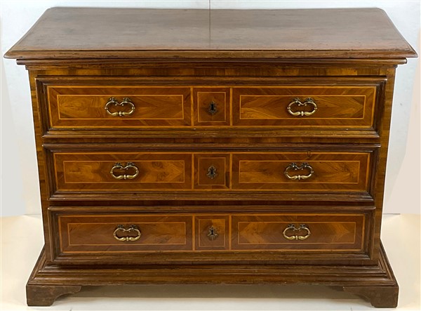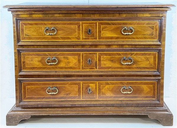Cassettone con fronte e fianchi pannellati e lastronati con filettature in legni vari, a tre cassetti piu un tiretto sottopiano, piedi a mensola. (cm 168x113x66) (difetti, rifacimenti e restauri)