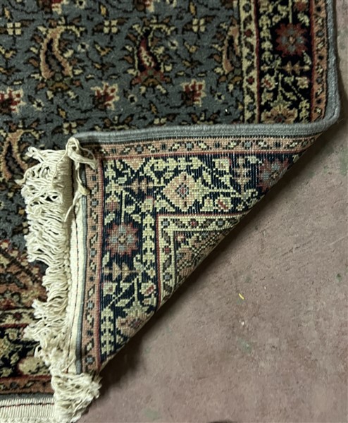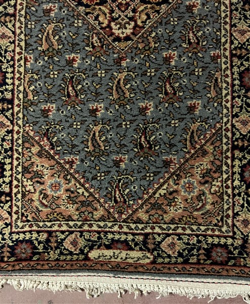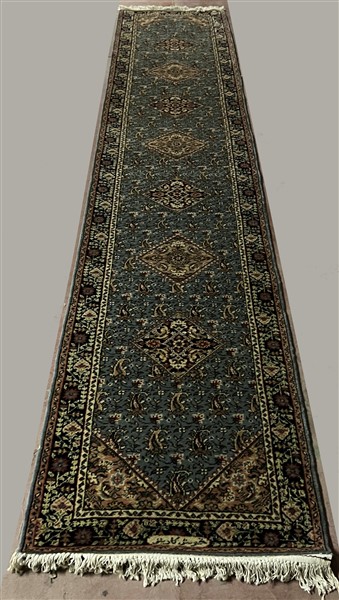 Tappeto passatoia romeno, secolo XX. Decoro con medaglioni romboidali su fondo azzurro, cartiglio ad una testata (cm 392x78) (difetti)