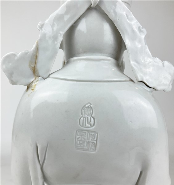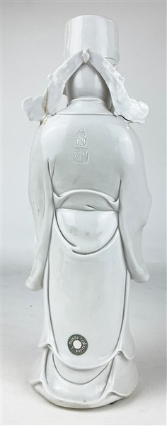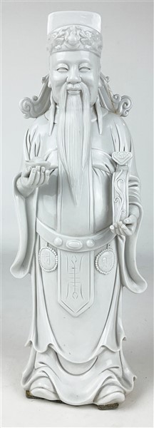 Statuetta in porcellana bianca Dehua raffigurante il dio delle ricchezze con il lingotto in mano recante etichetta Collezione Perotto