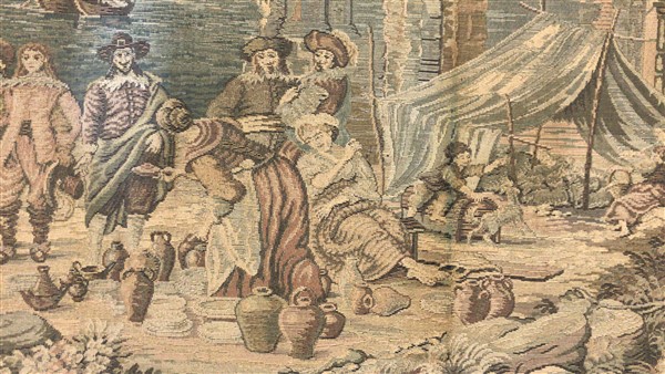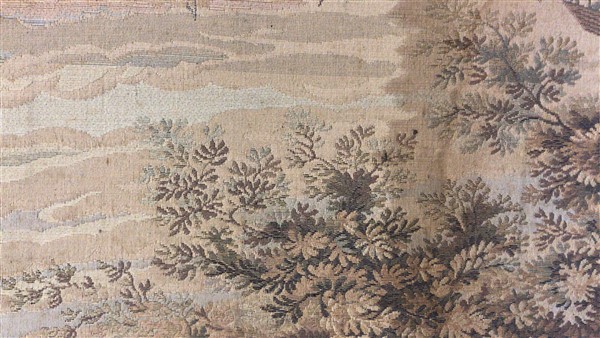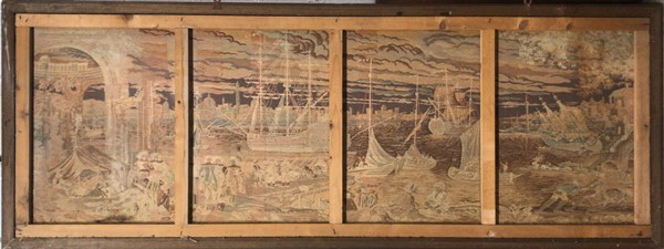 Arazzo meccanico, secolo XX. Raffigurante porto di mare con vascello e architetture (cm 195x70) (difetti e macchie)